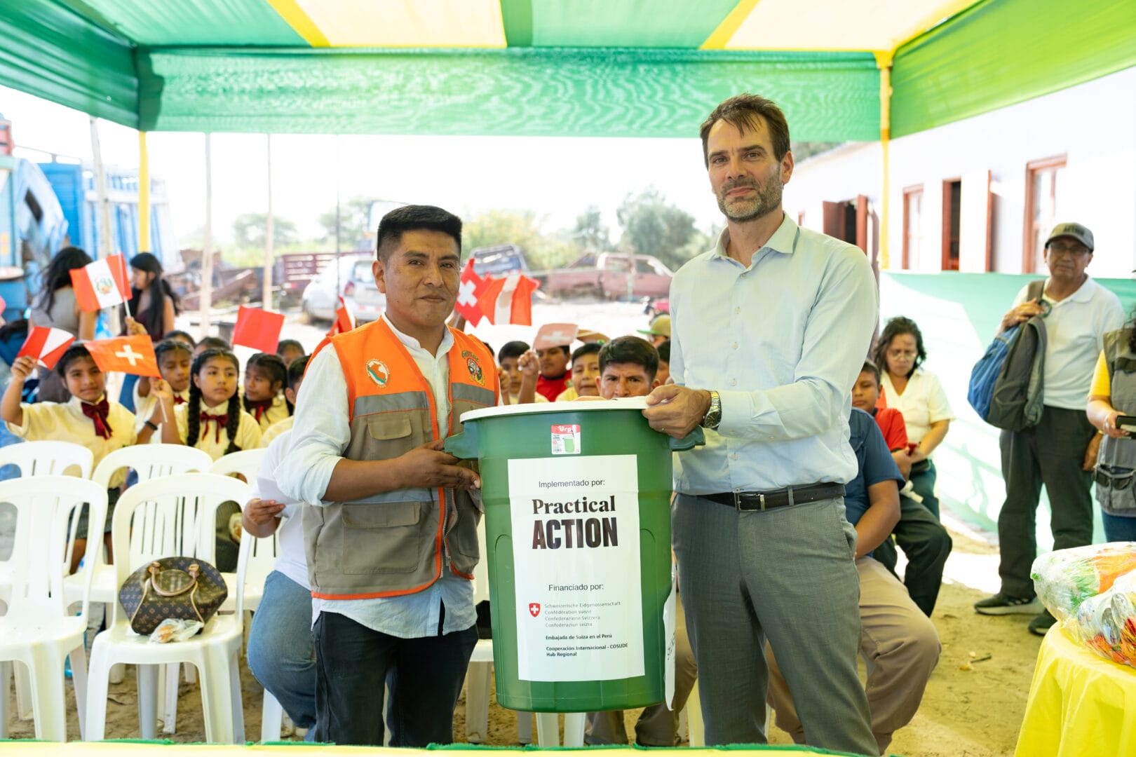 El evento oficial de la entrega del material contó con la presencia del jefe adjunto de la Embajada de Suiza en el Perú, Lukas Heinzer, y el alcalde encargado de Cura Mori, Amado Lalupú Ipanaqué. Previamente, se realizó una visita de terreno para identificar puntos críticos de riesgo y constatar las preparaciones tomadas por los actores locales. La visita fue acompañada por las autoridades de la municipalidad distrital de Cura Mori, de INDECI Piura y el equipo del Programa de Resiliencia Climática de Practical Action.