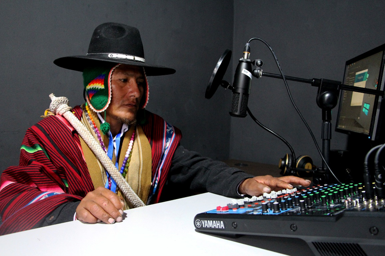 Roberto Gutiérrez, mallku de la Marka Corpa, participa en la producción de mensajes radiales sobre gestión del riesgo de desastres. Su liderazgo promueve la comunicación comunitaria como herramienta para la prevención y la protección del territorio.