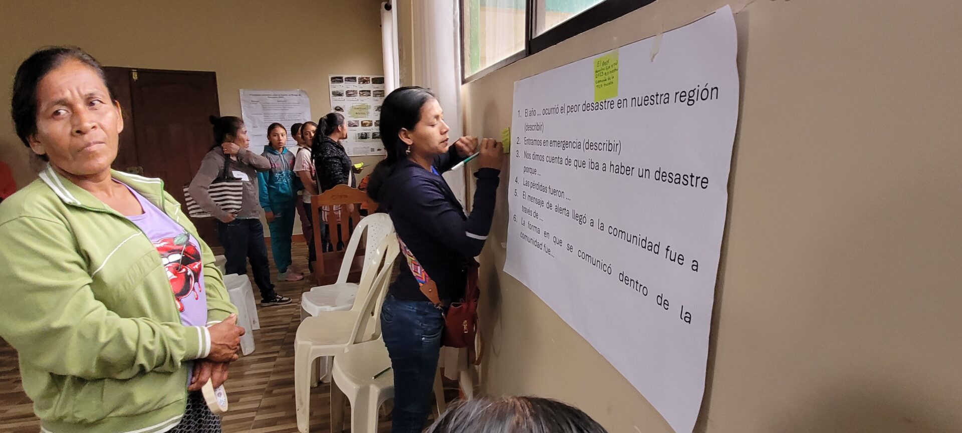 Brayan Quispe, Practical Action acompaña en la logística de este proceso, opina que el lenguaje menos técnico y el rescate la experiencia de las comunidades logra que la interacción sea mucho más fluida entre pares: “¡Esta era la clave! Durante mucho tiempo trabajamos capacitando a comunidades en gestión del riesgo, estas mujeres están llegando a las comunidades de una manera directa y que se entiende.”