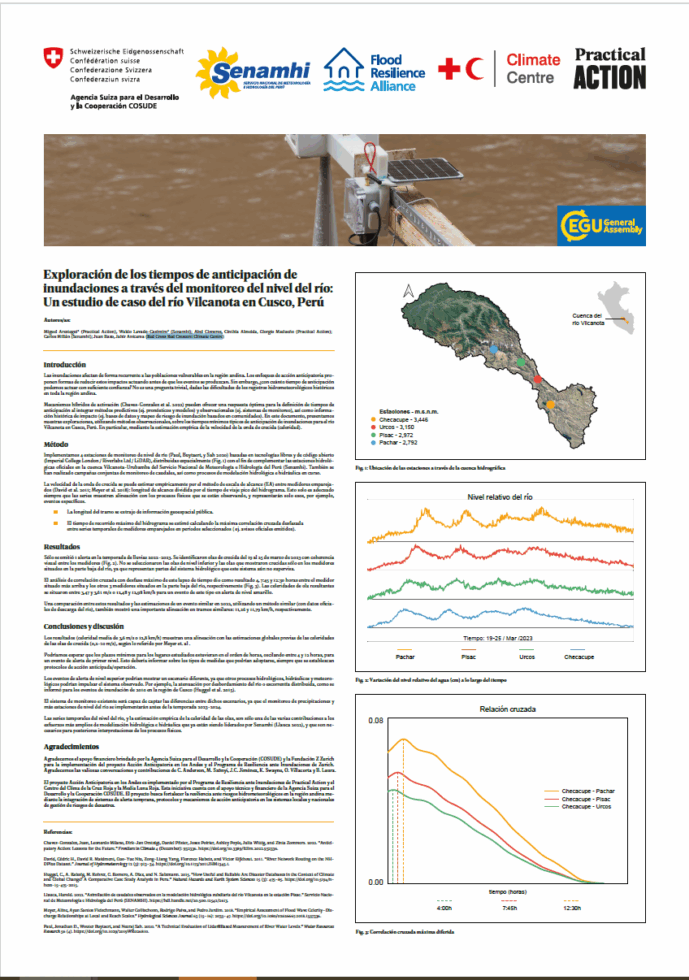 Las inundaciones afectan de forma recurrente a las poblaciones vulnerables en la región andina. Los enfoques de acción anticipatoria proponen formas de reducir estos impactos actuando antes de que los eventos se produzcan. Sin embargo, ¿con cuánto tiempo de anticipación podemos actuar con suficiente confianza? No es una pregunta trivial, dadas las dificultades de los registros hidrometeorológicos históricos en toda la región andina. Mecanismos híbridos de activación (Chaves-Gonzalez et al. 2022) pueden ofrecer una respuesta óptima para la definición de tiempos de anticipación al integrar métodos predictivos (ej. pronósticos y modelos) y observacionales (ej. sistemas de monitoreo), así como información histórica de impacto (ej. bases de datos y mapeo de riesgo de inundación basados en comunidades). En este documento, presentamos nuestras exploraciones, utilizando métodos observacionales, sobre los tiempos mínimos típicos de anticipación de inundaciones para el río Vilcanota en Cusco, Perú. En particular, mediante la estimación empírica de la velocidad de la onda de crecida (celeridad).